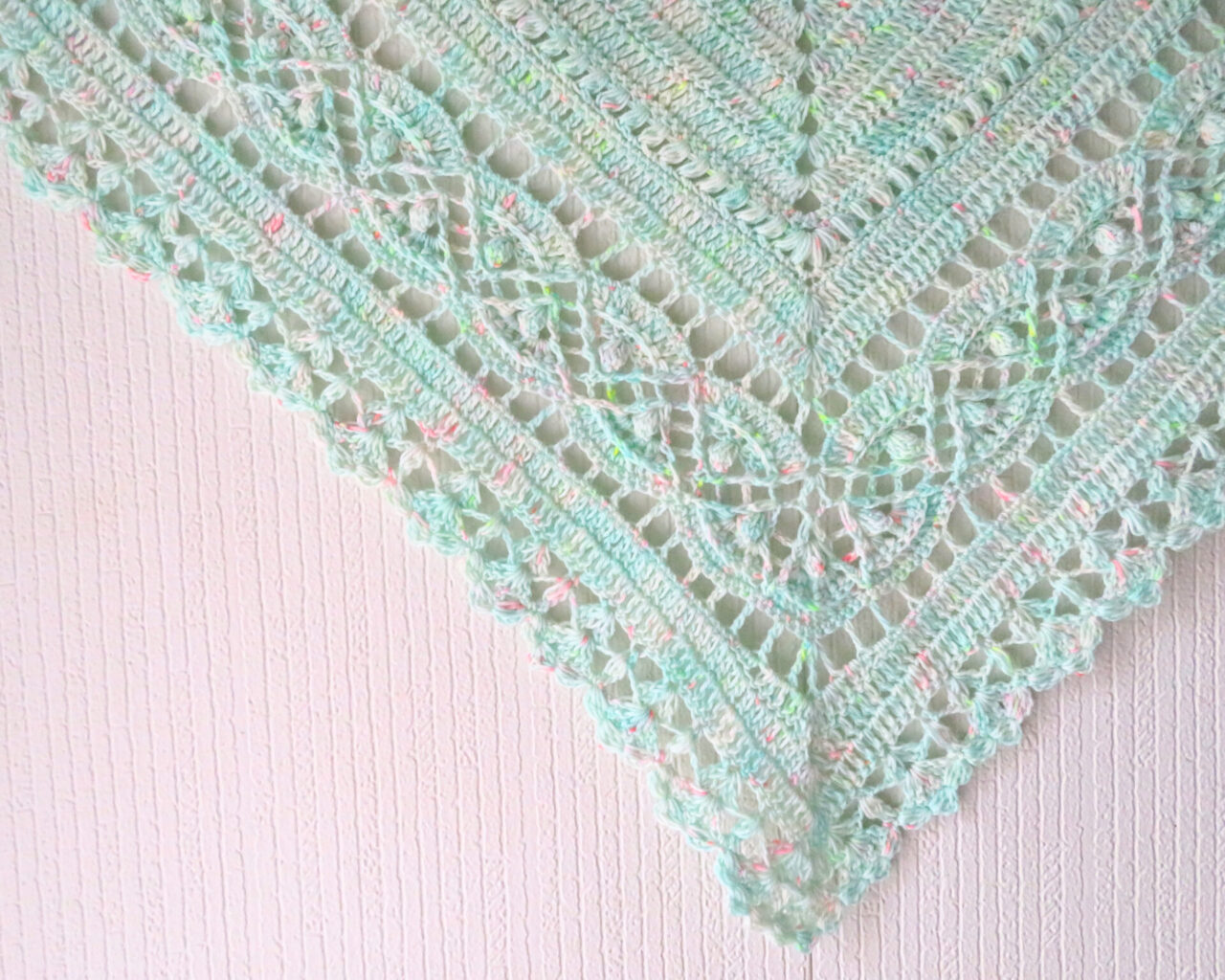 東京ヤーンクロール2025 とのコラボレーションパターンの三角ショールです。スモールサイズとラージサイズが選べます。